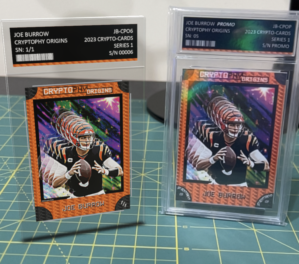 My goal is to bring unique collectible cards to collectors in unique ways. One of these ways is through a digital format created in Vectary. Vectary allows me to create a 3D model of the collectible card and produce an Augmented Reality (AR) version of this card, which can be viewed on any electronic device that is able to scan the QR code. Below you will find an example of the Vectary solution. The 4th example is a side by side of the AR model and the physical card.